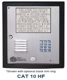 • CAT 10 display provides 10 names per directory screen. Character size: 1/2”H. 10 rows by 20 columns. • Display is backlit and visible in bright sunlight . • Two wiegand card reader inputs. • Two entrance control with 2 relays. • RS485 expansion port. • Database stores 6 credentials per resident code. • 56K baud modem. • 13,000 event log buffer. • Clock calendar. • Non-volatile memory. • Off-site card/code capacity expansion. No chips to change. • Dials Touch ToneTM or pulse. • Programmable via modem. • Remotely activated speaker and microphone. • Programmable PIN lengths, 1 to 6 digits. • REX (request to exit), alarm shunt and door sense input. Multi-level surge suppression protects all electrical connections. Must be grounded.