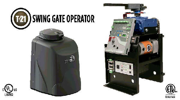 | Viking T-21 Swing Gate Operator or Opener The newly redesigned T-21™ 1/4" steel chassis with multilayer corrosion protection ensures reliability and long lasting operation in the harshest of environments. Built-in heater with thermostat control, 115/230 AC operation, Viking’s true battery backup, increased lightning strike protection and smooth start / stop operation are all standard features. The T-21™ swing gate operator has a 5 Year commercial or 7 residential warranty and a gate capacity of up to 2000 lbs.The removable power supply box includes LED indicators and communicates to the VFlex™ LCD screen, displaying the status of the AC line, surge protection and fuses of the operator. OPERATIONS SPECIFICATIONS