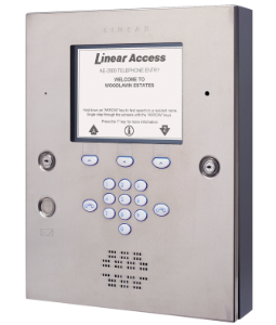 | Linear AE2000 PLUS Telephone Entry System As befitting Linear flagship telephone entry system, Linear has equipped the AE2000Plus with an attractive, highly functional display. Visitors will have no trouble using the AE2000Plus to locate and contact residents. A temperature compensated, back-lit, VGA resolution, LCD display presents up to 24 names at a time on separate alphabetical screens. That is in stark contrast to most telephone entry systems, which require you to scroll continuously through the entire alphabet, searching for a name. The three keys directly below the display operate as “soft keys,” changing functions with each mode. For instance, in the Directory Mode, the keys become A and Z directional controls for scrolling through the alphabetical listings. In the Information Mode, the keys permit switching between English and Spanish The guiding principle behind Linear AE2000Plus is that a telephone entry system should be a model of simplicity. Easy to specify. Easy to install. Easy to configure. Easy to expand. And above all, easy to use. A close examination of every aspect of this feature-rich system reveals that ease is an across-the-board attribute. A 10,000 user capacity is standard with the AE2000Plus. Commercial sites, like apartments, condominiums, residential communities, and industrial complexes can all benefit from its simplicity and expansive range of capabilities. The AE2000Plus provides control for up to four portals (gates and/or doors). It includes a built-in radio for adding remote control via user transmitters. No matter what size your telephone entry requirements run, it is likely that Linear can supply a system. With many years in the field, we have assembled a family of products to address nearly every need. By every meaningful measure, Linear makes telephone entry easy. AE2000Plus Commercial Telephone Entry System with Access Control - Four Doors, Large Screen is designed for use as a primary access control device for gated communities, parking garages, office buildings, apartments, dormitories, hotels/motels, commercial buildings and recreational facilities. Housed in a locked, rugged stainless steel faced enclosure, the AE2000Plus features a lighted keypad with bright, easy-to-read graphics, a large backlit display with programmable welcome message, a built-in microphone, speaker, and provision for an optional Model CCM-1 color CCTV camera. The cabinet is monitored with a magnetic tamper switch. The four relay output channels can be programmed to control electric door strikes, magnetic locks, door & gate operators, or barrier gates. The system utilizes hands-free, full duplex telephone communications between visitors and residents for granting access. Complete access control event logging, access time restriction, access location restriction, and administration functions are also available to manage the installation. For easy programming, the AE2000Plus contains Linear's built-in browser-based AXNET software. The system can be programmed and maintained from any computer world-wide, without using dedicated computer software. The AE2000Plus is also compatible with Linear’s powerful AccessBase2000 dedicated access control PC software. The AE2000Plus is network ready. AE2000Plus units can be interconnected with Linear’s AM3Plus and AE1000Plus Telephone Entry Systems through a 3-wire RS-485 or modem network. The AE2000Plus can be used in networks with the legacy AM-3, AE-1000, and AE-2000 Telephone Entry Systems in installations programmed with AccessBase2000 software only. Two Wiegand inputs are available for connection of 26, 30, or 31-bit Wiegand devices (card readers, etc.). Three sets of PBUS inputs are available for connection to Linear’s line of remote accessories |