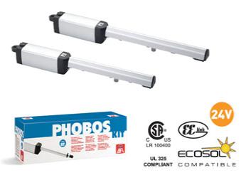 | Technical Features PHOBOS BT PHOBOS BT L Control panel LIBRA UL R LIBRA UL R Reversible/irreversible operator irreversible irreversible Power supply 120 V 60 Hz single-phase 120 V 60 Hz single-phase Absorbed power 0.05 hp (40 W) 0.05 hp (40 W) Thermal protection integrated in the control unit integrated in the control unit Rod working stroke 11.6’’ (295 mm) 16.1’’ (410 mm) Rod speed 0.78”/sec (20 mm/s) 0.78”/sec (20 mm/s) Opening and closing time 14 s 20 s Impact reaction torque limiter integrated in the control panel torque limiter integrated in the control panel Lock mechanical on opening/closing mechanical on opening/closing Manual release release key release key Operating cycle intensive use intensive use Environmental conditions from -4°F (-20°C) to 140°F (+ 60°C) from -4°F (-20°C) to 140°F (+ 60°C) Degree of protection IP44 IP44 Operator weight 11lb (~5 kg) 14.3 lbs (~6,5 kg) Dimensions see below see below Fuse value (Libra board tansformer) 2A T 2A T Fuse value (Libra board logic unit) 1A T 1A T |