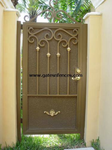 | If your seeking high quality garden gates or walk thru gates you have come to the right place! L. A. Ornamental Corp offers a unlimited selection of Aluminum or Wrought Iron Garden Gates. Please feel free to browse through our wide selection of garden gates or walk thru gates. We offer designs you will not find anywhere else! A garden gate is more than just a door to the backyard, Garden gates can be used as focal points, which are visual tools that bring the landscape design into focus and gives it definition. It represents a passage from the world outside into the personal sanctuary that is your garden. It will visually define and add beauty to the yard, but garden gates are functional as well as aesthetically beautiful. They provide privacy for your family and add a level security to the yard by discouraging intruders. A well-constructed garden gate will keep your kids and pets in, or other people’s kids and pets out While controlling access to your property may be an important part of your decision on buying a garden gate or walk thru gate, our gates can visually enhance your property. Each gate offers elegance and beauty, while serving as a secure and safety solution for your entry way needs. |