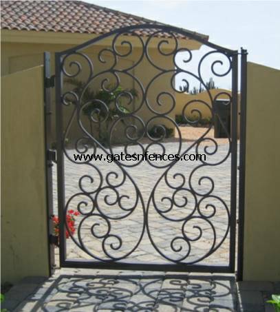 | Tuscany: Top photo the Garden Gate at our shop, 2nd photo installed in the Island of Aruba and matching Driveway Gate below. The Frame of this gate is 2 X 2 X .125, the inner scrolls are from solid plate 3/8 X 1" -- A solid plate on the hinge side was use as a large opening was required the standard is a 2" X 2" X .125 on both sides, the top arch is 1" X 2" X .125, the hinges that are normally use are spring style and not the j-bolt type that are on this gate this was a requirement by the customer. If your seeking high quality garden gates or walk thru gates you have come to the right place! L. A. Ornamental Corp offers a unlimited selection of Aluminum or Wrought Iron Garden Gates. Please feel free to browse through our wide selection of garden gates or walk thru gates. We offer designs you will not find anywhere else! |
