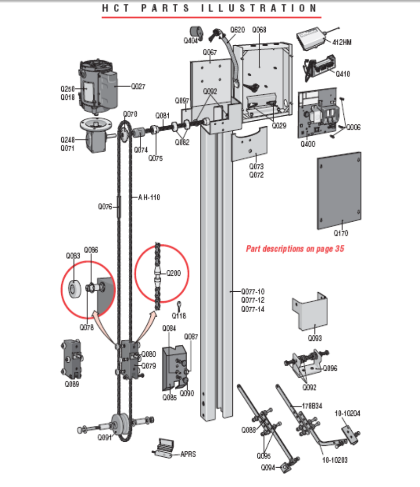 Q086 - Retaining Spring Clip Q087 - Emergency Pulling Ring Q088 - Gate Arm Q089 - Trolley Body Assembly Q090 - Plastic Plug Q091 - Idler Sprocket Q092 - Rubber Isolator Q093 - Idler Sprocket Cover Q094 - Arm Bracket Q095 - Arm Bushing Q096 - Header Bracket 10-10203 - Curved Arm Assembly 10-10204 - Door Bracket 178B34 - Straight Arm Assembly Q097 - Mounting Plate Q118 - Key for Access Door/Hercules Q170 - Electronic Box Cover (Black) Q200 - Chain Coupling/Release Q248 - Gear Reducer (40:1) Post 2/99 Q250 - 1/2 HP Electric Motor Post 2/99 Q400DHCT - OmniControl Board Post 2/07 Q404 - Omni Alarm Q410 - Surge Suppressor Terminal Block Q620 - Motor Harness Omni APBS1 - Reset Button 40-3505 - U.L. Warning Sign (not shown) |