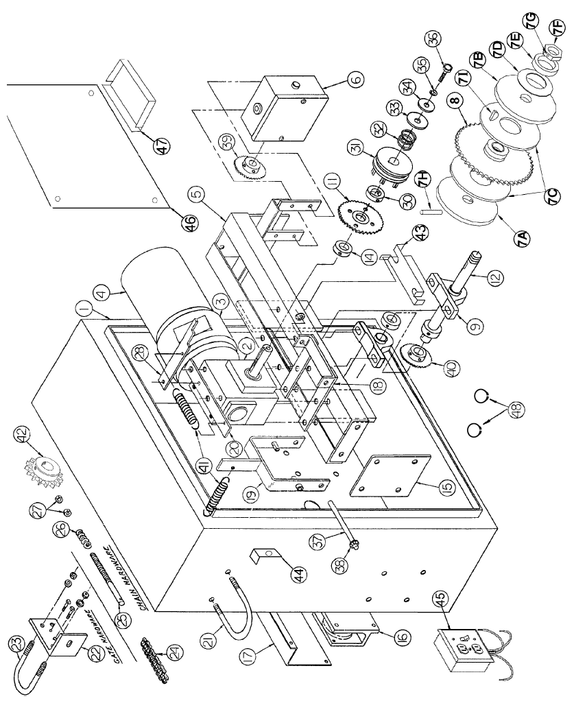 Item Parts # Description for OSCO GSLG-A Gate Operators 2120-359-BT Complete Enclosure with Door Assembly 1 2120-144-BT Enclosure without Door 2120-360-BT Complete Door and Lock Assembly 2300-716 Stop/Reset Button Cover 2500-2192 C-Face Brake, 115/230V 2500-2193 C-Face Brake, 460V 5 2110-265 Rail Assembly 15 2100-573 Spacer Plate 2100-661 Back Brace 12 2100-1738 Drive Shaft, 1" 48 2400-501 Retaining Ring 9 2200-274 Bearing, 1" 43 2100-1737 Pillow Block Retaining Plate 40 2200-042 Sprocket, 48 B 15, 1" bore 2200-015 Shaft Collar, 1" 7 2120-388 Torque Limiter Assembly, 5 1/2” 7A 2100-1650 Plate with Solid Pin Groove 7B 2100-1661 Keyed Plate 7C 2300-390 Friction Disc (pair) 7D 2200-817 Belleville Washer 7E 2100-1621 Belleville Washer Retaining Disc 7F 2100-1622 Adjustment Nut 7G 2400-407 Brass Tipped Set Screw 7H 2400-416 Dowel Pin 7I 2100-529 Woodruff Key 8 2210-004 Sprocket, 40-A-48, with Bearing 42 2200-886 Drive Sprocket, 50-B-20, 1” Bore 2110-788 Gear Reducer/Disconnect Assembly 2 2200-920 Gear Reducer, 15:1 19 2120-132 Shifter Lever Assembly 18 2110-362 Shifter Lever Fulcrum Assembly 37 2100-551 Shifter Lever Rod 38 2400-169 Pal Nut 20 2100-1133 Locking Lever Plate 28 2100-910 Locking Lever 41 2200-291 Shifter and Locking Lever Spring 14 2200-014 Shaft Collar, 1" 11 2110-364 Sprocket, 40 A 24, with Bearing 30 2200-549 Disconnect Collar, 1" (keyed) 31 2110-131 Shifter Block 2400-133 Key, 1/4" x 1/4" x 2 1/4" 32 2200-115 Disconnect Spring 44 2510-248 Stop/Reset Button & Bracket Assembly 2100-1760 Stop/Reset Button Mounting Bracket 2500-1495 Stop/Reset Button 45 2510-251-D Power On/Off Disconnect Assembly with Receptacles (115V Models only) 2500-1956 115VAC Duplex Receptacles only 2500-1957 115VAC Switch only 2510-252-D Power On/Off Disconnect Assembly for 230V Models 2500-2205 230VAC Switch only 2510-294 Power On/Off Disconnect Assembly for 3-Phase Operators 2500-034 Power Switch only 46 2100-1756 Mounting Plate 47 2100-1781 Accessory Shelf for single phase models only 33 2400-308 Fender Washer, 3/8" 34 2400-017 Flat Washer, 3/8" 35 2400-016 Lock Washer, 3/8" 36 2400-014 HHCS, 3/8"-16 x 1" 16 2110-700 Idler Assembly 2300-697 UHMW Idler Wheel 2100-1731 Idler Shaft 6 2520-173L Rotary Limit Box Assembly 2500-764 Limit Switch 2100-057 Standard Limit Shaft 2200-030 Limit Nut 2100-261 Detent Plate 2110-162 Limit Box Enclosure with Cover 2100-756 Limit Box Cover only 2200-029 Flange Bearing, 1/2" ID 2200-193 E-Ring, 1/2” 2400-203 Spring Washer, 1/2” 2200-042 Limit Drive Sprocket, 48-B-15, 1” bore For drives up to 34 feet wide: 39 2200-008 Limit Box Sprocket, 48-B-10, 1/2” bore 2200-922 #48 Chain, 25 Links For drives from 35 to 49 feet wide: 2200-041 Limit Box Sprocket, 48-B-15, 1/2” bore 2200-200 #48 Chain, per foot, 27 Links For drives 50 to 65 feet wide: 2200-276 Limit Box Sprocket, 48-B-20, 1/2” bore 2200-654 #48 Chain, per foot, 29 Links required For drives over 65 feet wide: 2200-432 Limit Box Sprocket, 48-B-30, 1/2” bore 2200-654 #48 Chain, per foot, 32 links required 2200-010 #48 Master Link 2200-605 #40 Chain, 37 Links 2200-006 #40 Master Link |
