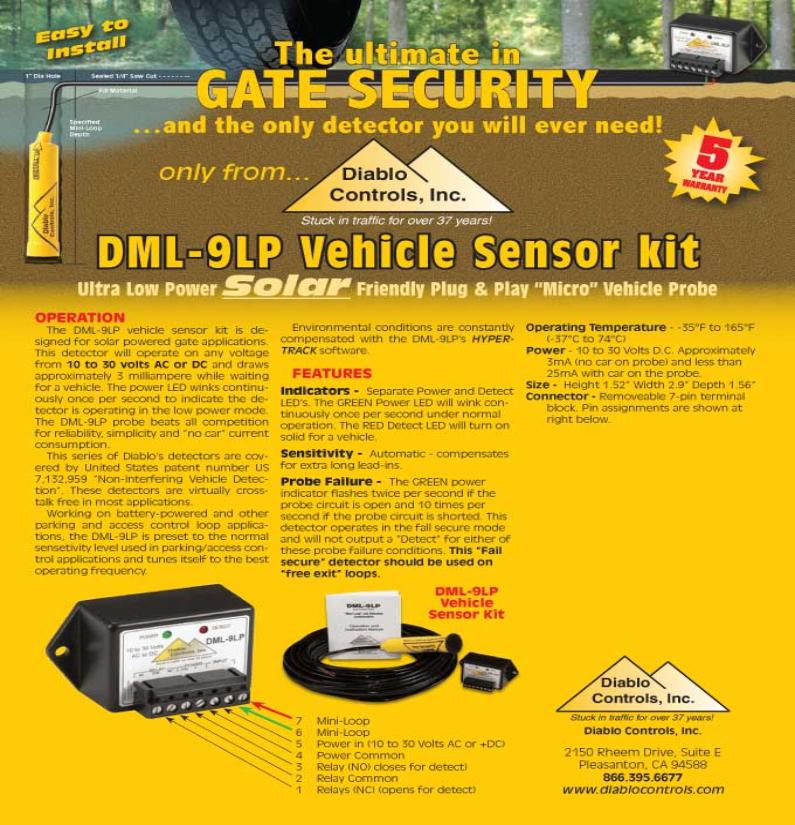 | Diablo Controls DML- 9LP Probe Kit Vehicle Loop Detector This probe kit, as with all of our probe/mini-loop kits work as "free exit - pulse only devises". The DML-9LP is a plug and play device and requires no settings. It also operates as a low current draw device and runs on 10 to 30 volts AC or DC. |