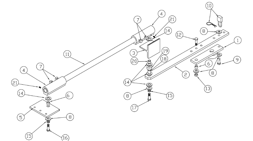 ARM ASSEMBLY 2120-449-BT Complete Arm Assembly 1 2100-1913-BT Crank (not included in arm assembly) 2 2100-1722-BT Crank Extension 3 2100-1924-BT Overtravel Stop 4 2100-1597 Gate Arm Clamp 5 2100-1733-BT Gate Plate 6 2200-783 Spacer - black, 1/2” ID x 3/4” OD x 9/16” LTB 7 2400-378 Set Bolt, 5/16”-18 x 3/4” 8 2400-376 Flat Washer 9 2100-1547 Disconnect Pin 10 2400-351 Disconnect Hair Pin 2200-034 Disconnect Lock (optional) 11 2100-122-BT Pipe Link, 1” 12 2400-380 HHCS, 1/2”-13 x 1 3/4” 13 2400-418 Nylon Lock Nut, 1/2” 14 2300-238 Nylon Washer, 3/4” ID 15 2400-433 Split Lock Washer, 1/2” 16 2400-434 HHCS, 1/2-13 x 1 1/4” 17 2400-482 HHCS, 1/2-13 x 2 1/2” 18 2100-1725 Spacer - yellow, 3/4” OD x 1/2” ID x 3/4” LTB 19 2100-1932-BC Spacer - black, 1 1/4” OD x 1/2” ID x 1/2” LTB 20 2100-1320 Spacer - zinc-silver, 3/4” OD x 1/2” ID x 1/2” LTB 21 2400-309 Set Screw, 1/4” - 20 x 1 |