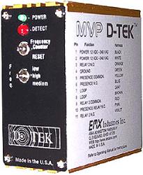 EMX MVP D-TEK loop detector 9V to 220V AC or DC The EMX MVP D-TEK loop detector is 9V to 220V AC or DC and is designed to be a universal voltage loop detector. The MVP D-TEK solves the problem of not knowing which voltage to have for your installation. Benefits include: Universal voltage Reduced inventory costs Operates in both fail safe and fail secure modes Power 9 VDC to 240VAC EMX D-TEK MVP Multi Voltage Power Universal Loop Detector -- $109.95
